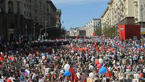 A Moscou, alors que la mairie a donné son accord pour la manifestation du 5 mai sur l'avenue Sakharov, un peu excentrée, en raison de la préparation de la parade et du Régiment Immortel, Navalny refuse et appelle les gens à manifester en plein centre, pour tenter de se diriger vers le Kremlin. Il marche dans les grandes rues commerçantes du centre. Cela présente surtout le très grand intérêt de pouvoir remplir la scène avec des figurants, ici des passants, qui n'ont rien à voir avec la manifestation mais permettent de donner l'impression de masse. De plus, une manifestation autorisée ne présente aucun intérêt, pas d'arrestations, pas d'images - et donc moins de financements à venir.